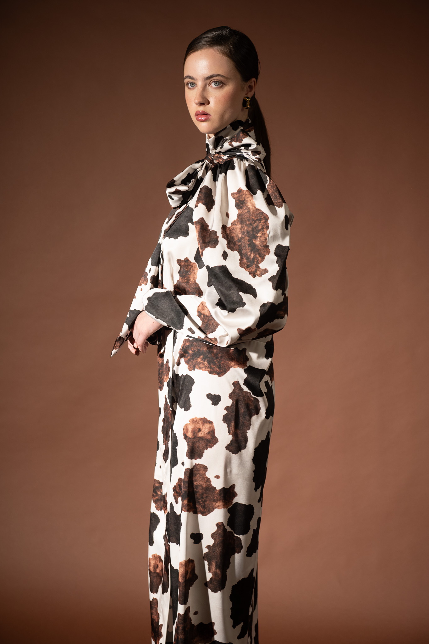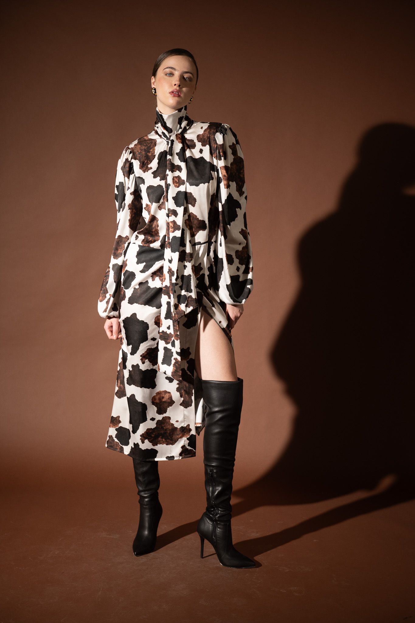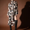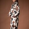 Make a statement with this luxurious satin midi dress, featuring a bold print pattern. Designed with a high neckline and long sleeves, it drapes beautifully on the body, offering both sophistication and comfort. The fluid satin fabric enhances movement, while the side slit adds a touch of modern allure. Finished with a self-tie belt to define the waist, this dress is perfect for evening occasions or elegant daytime looks.