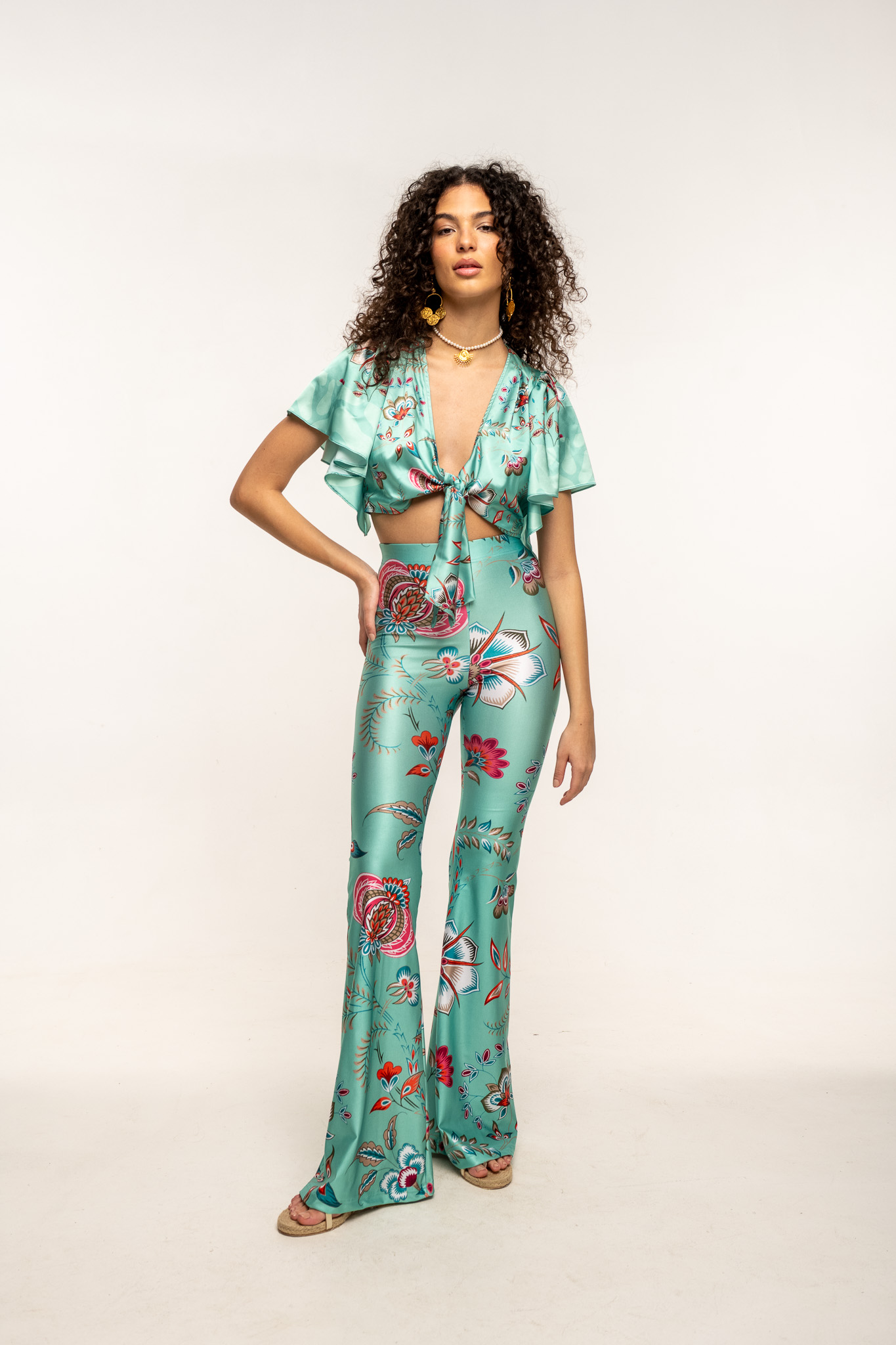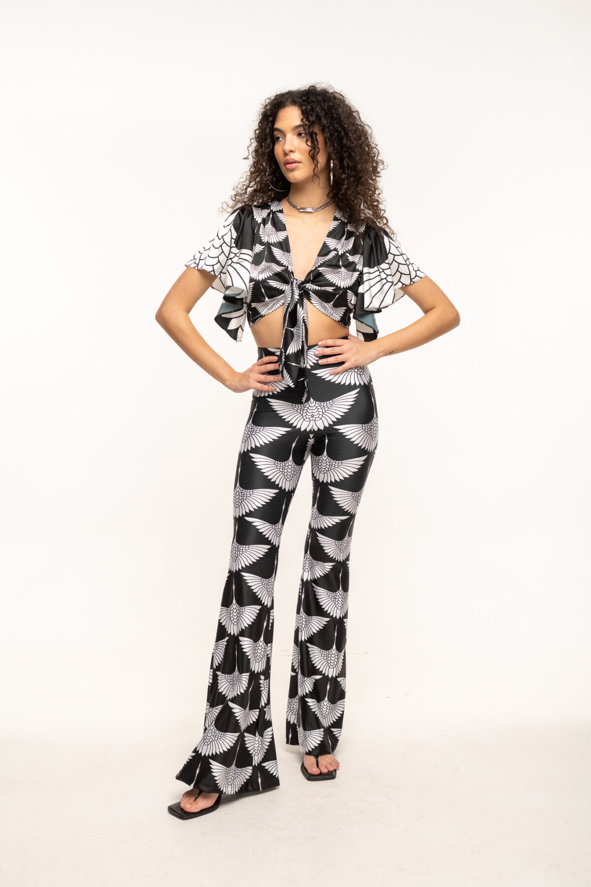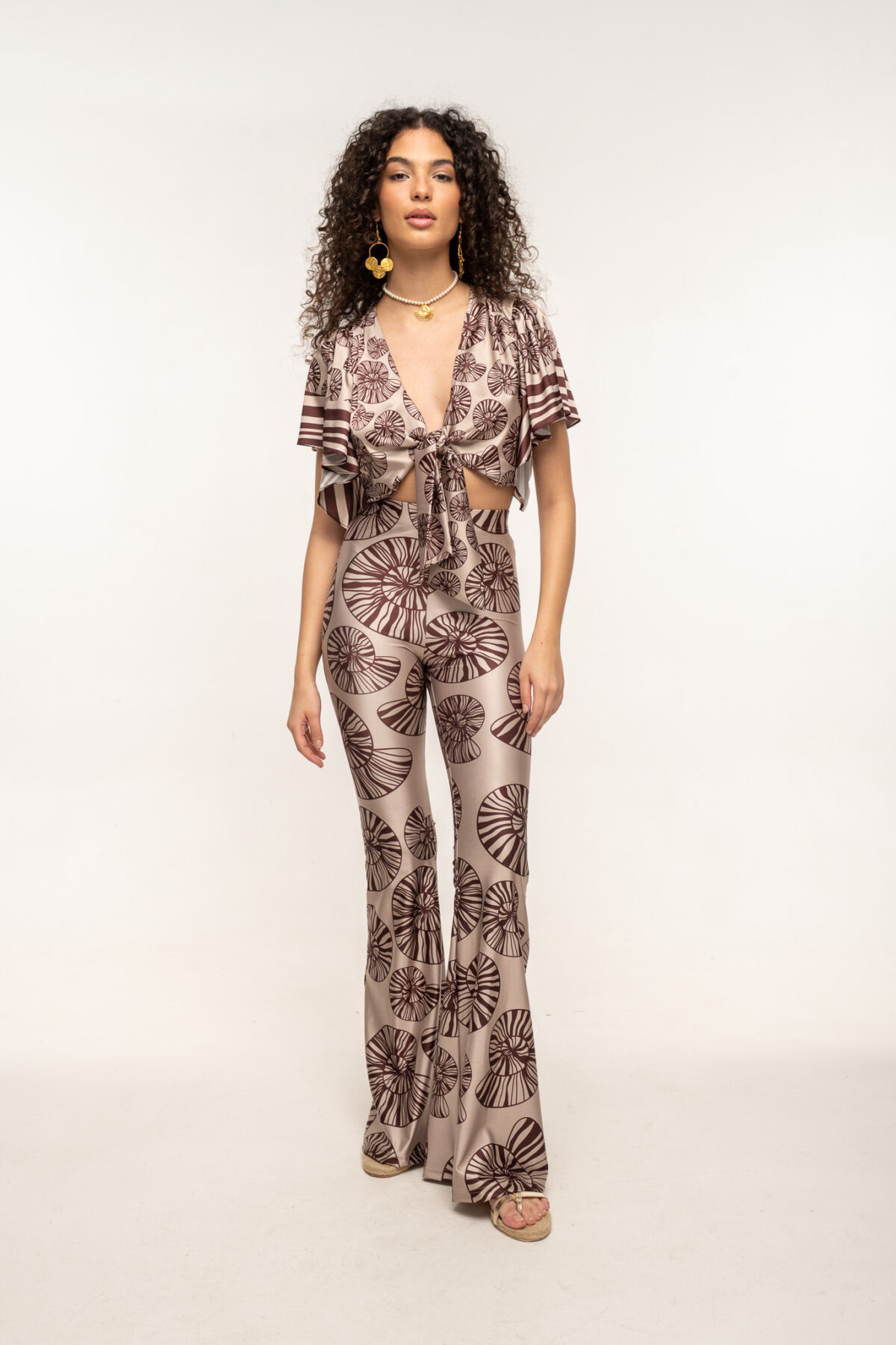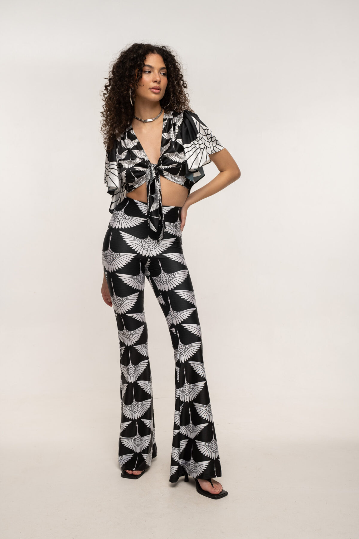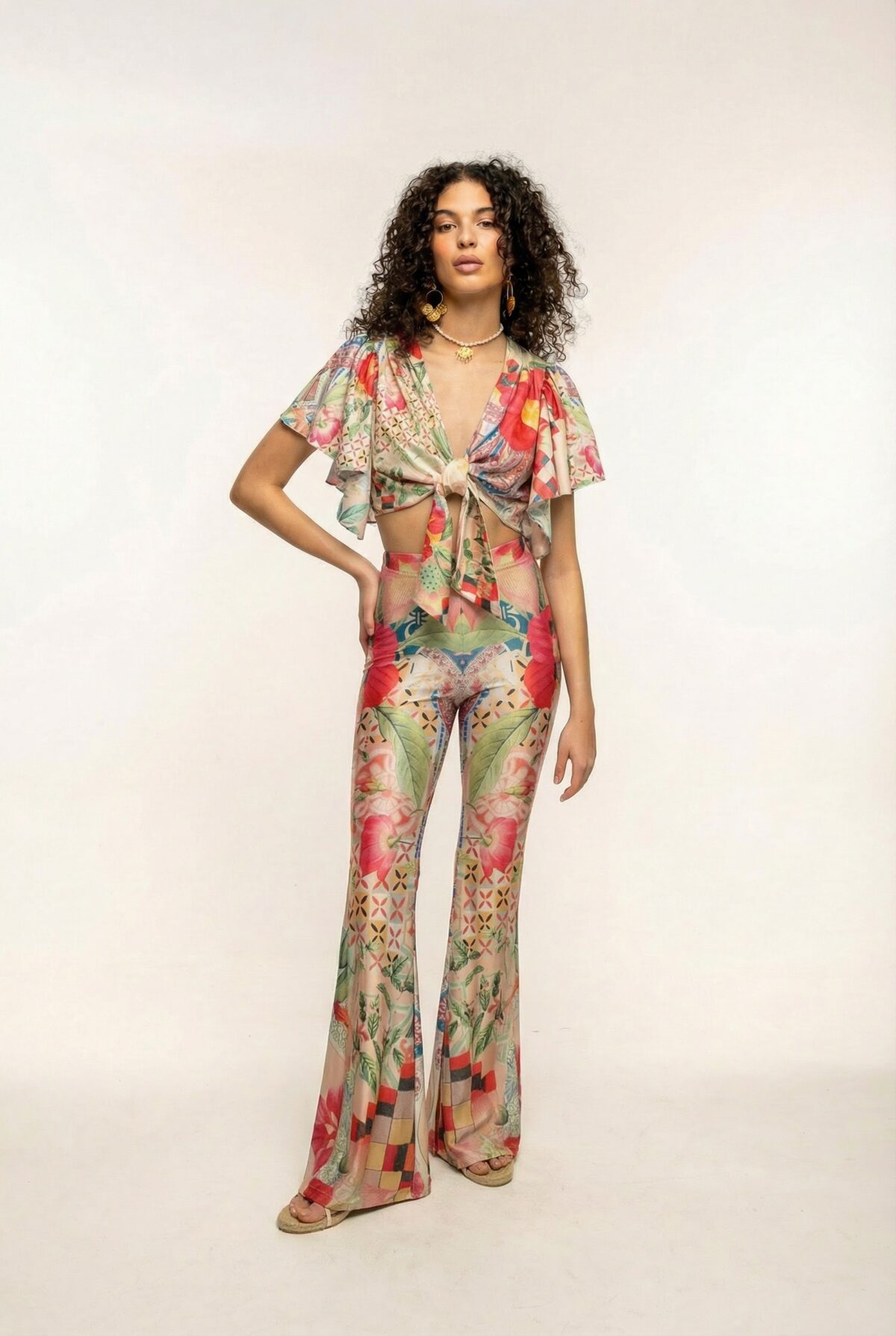 Flared pants in printed stretch lycra with a relaxed, fluid silhouette.