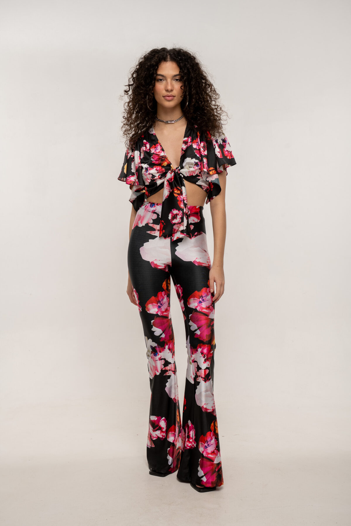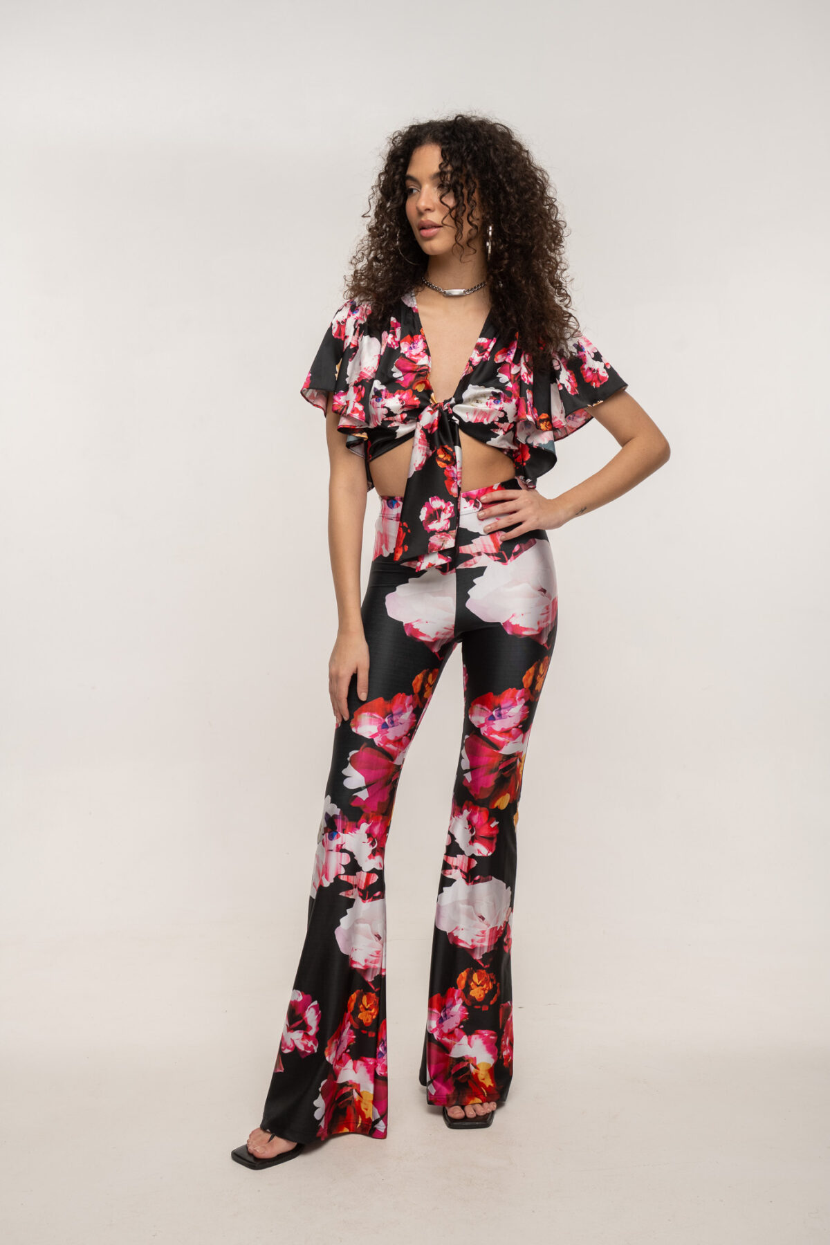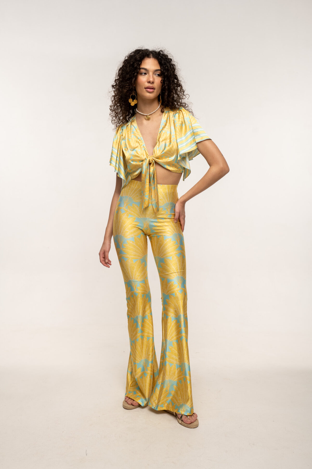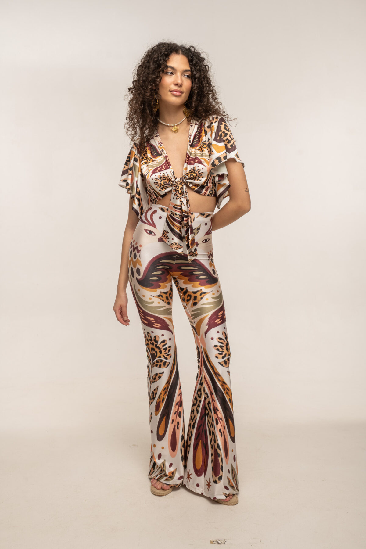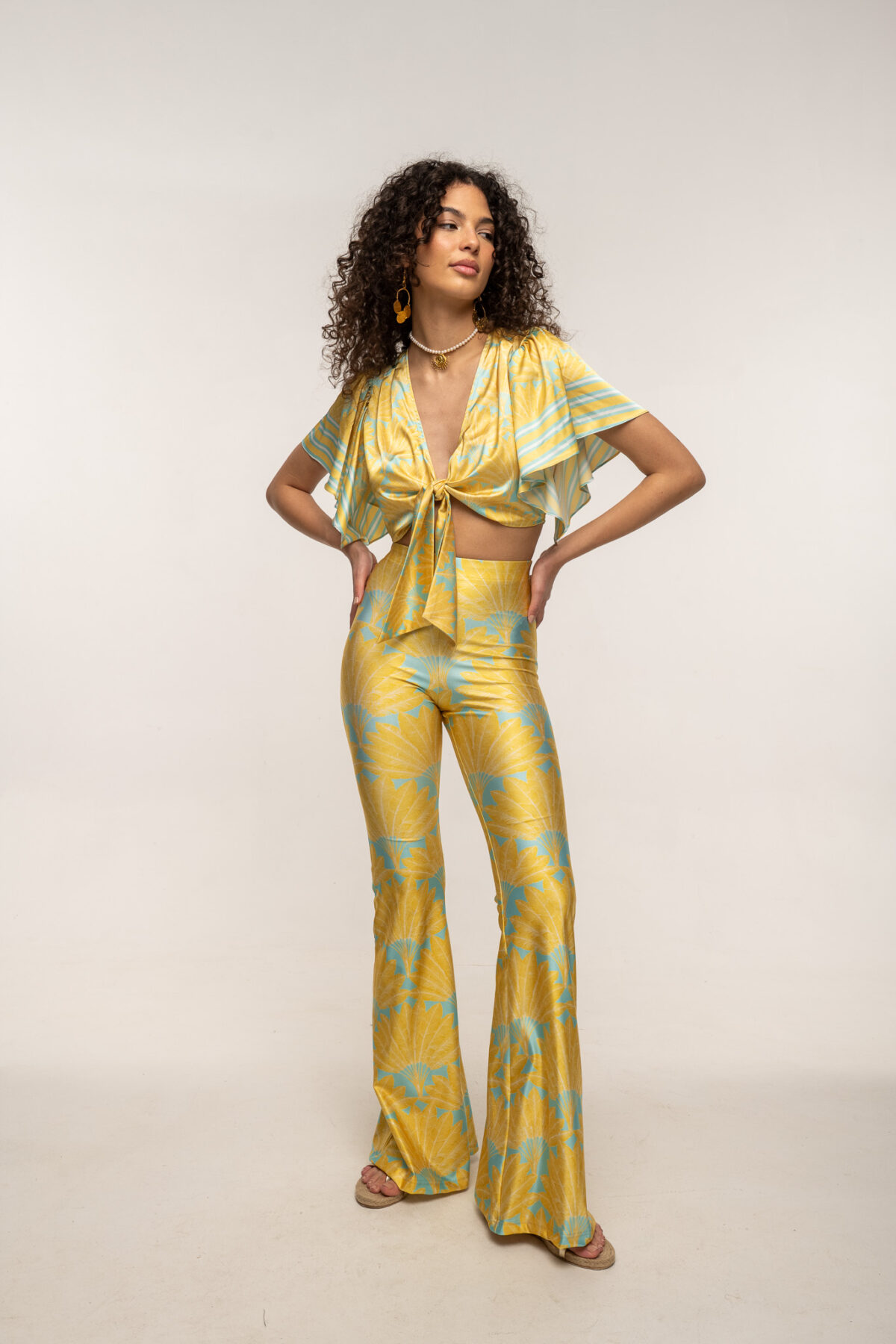 Flared pants in printed stretch lycra with a relaxed, fluid silhouette.