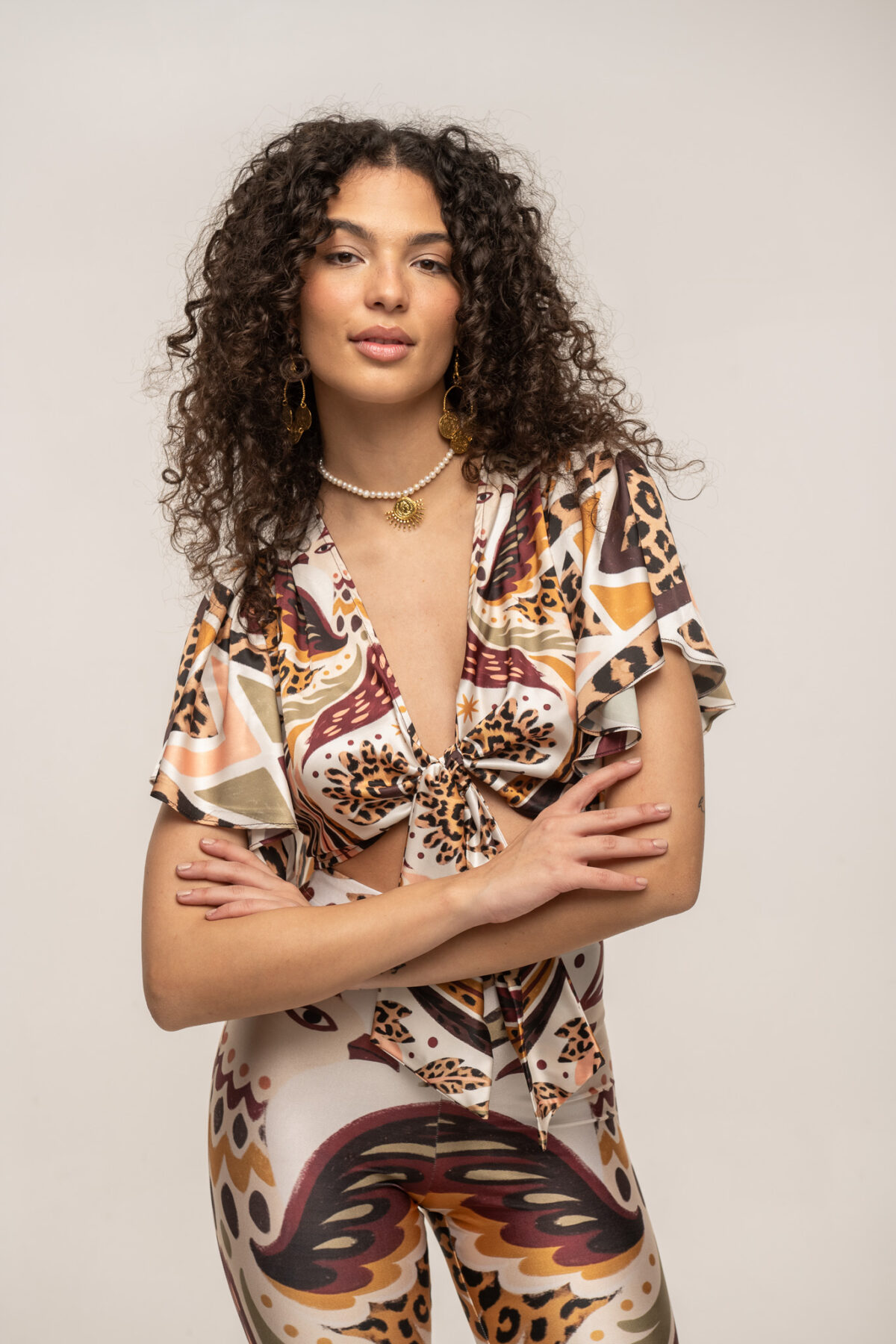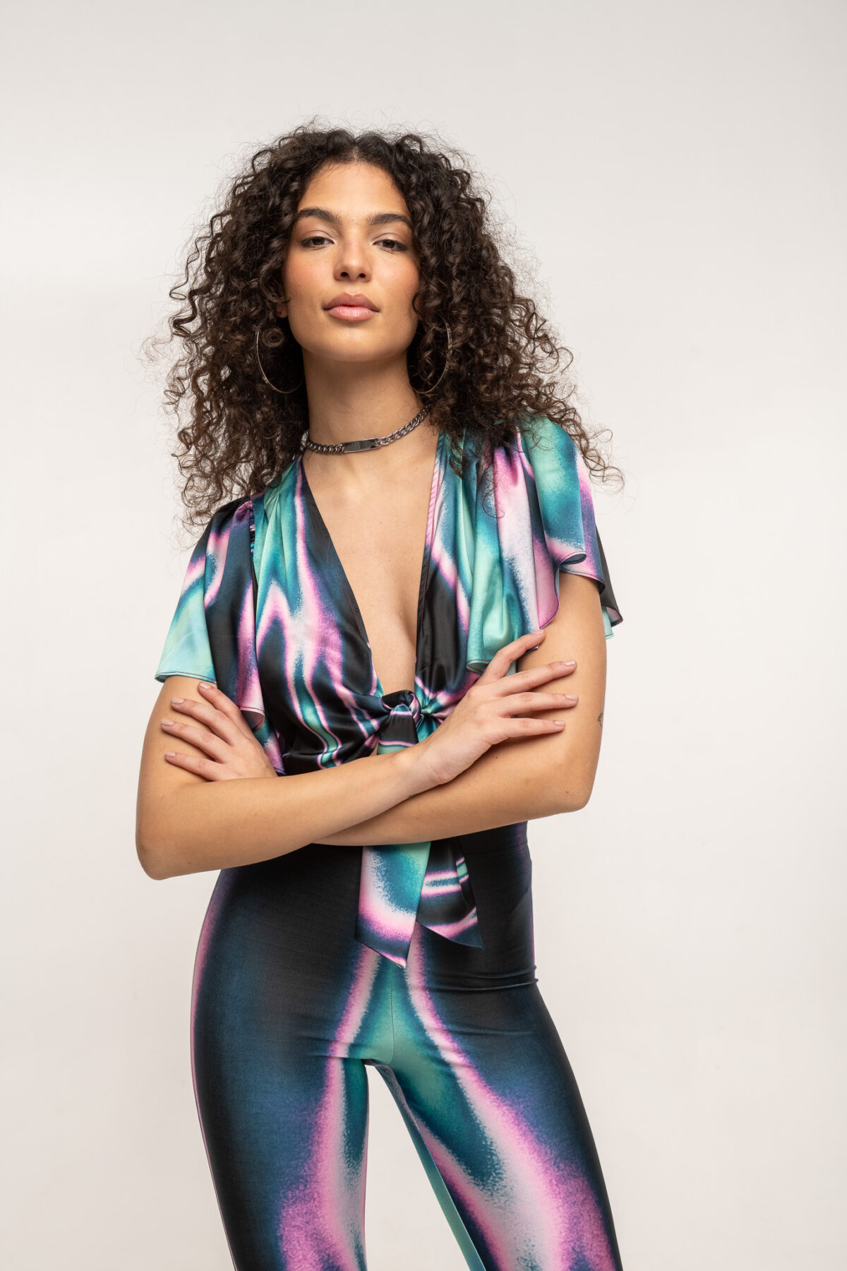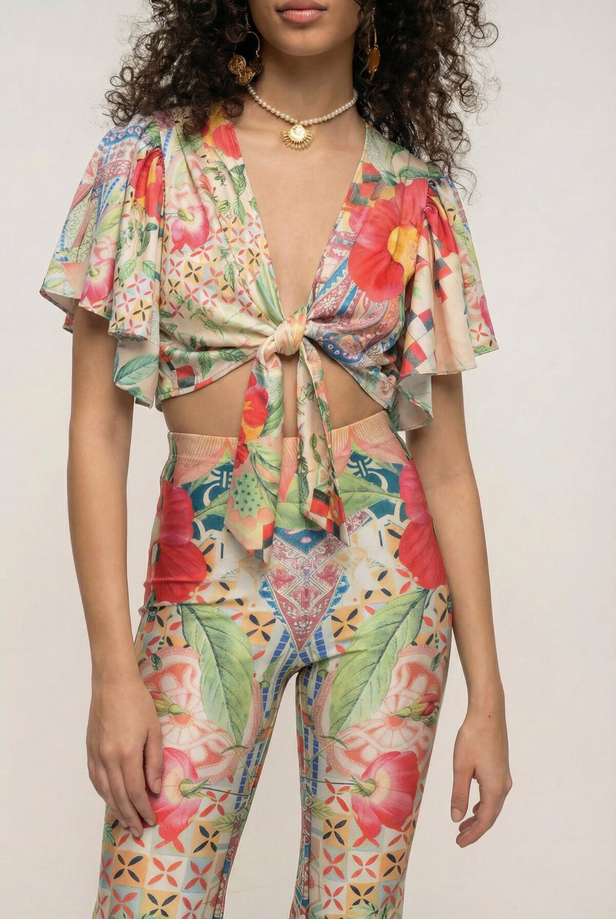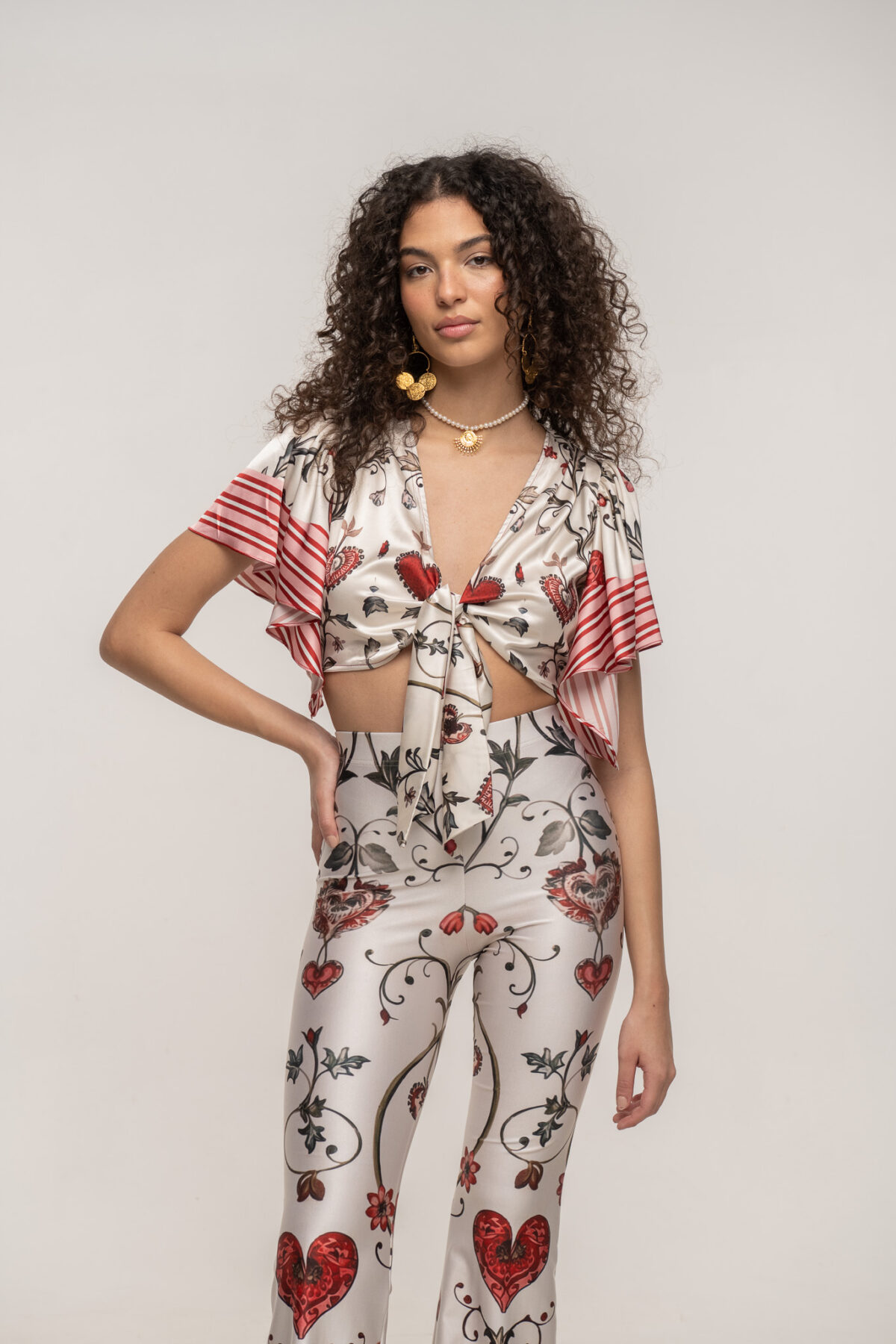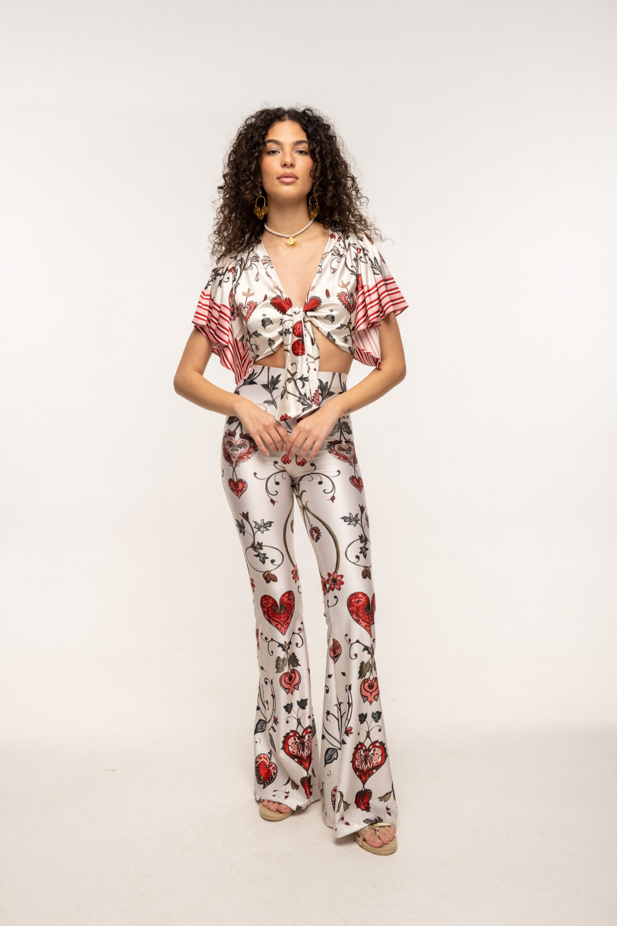 Flared pants in printed stretch lycra with a relaxed, fluid silhouette.