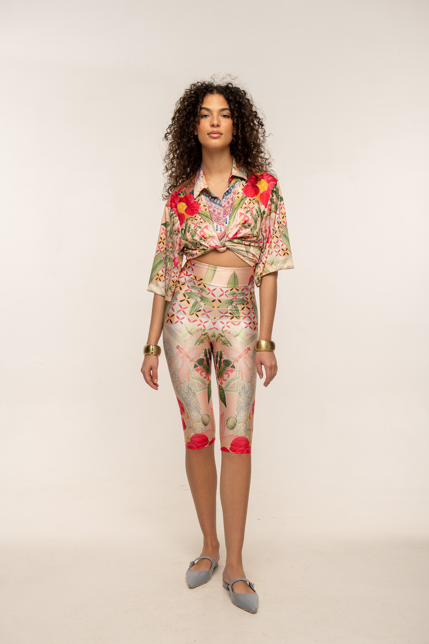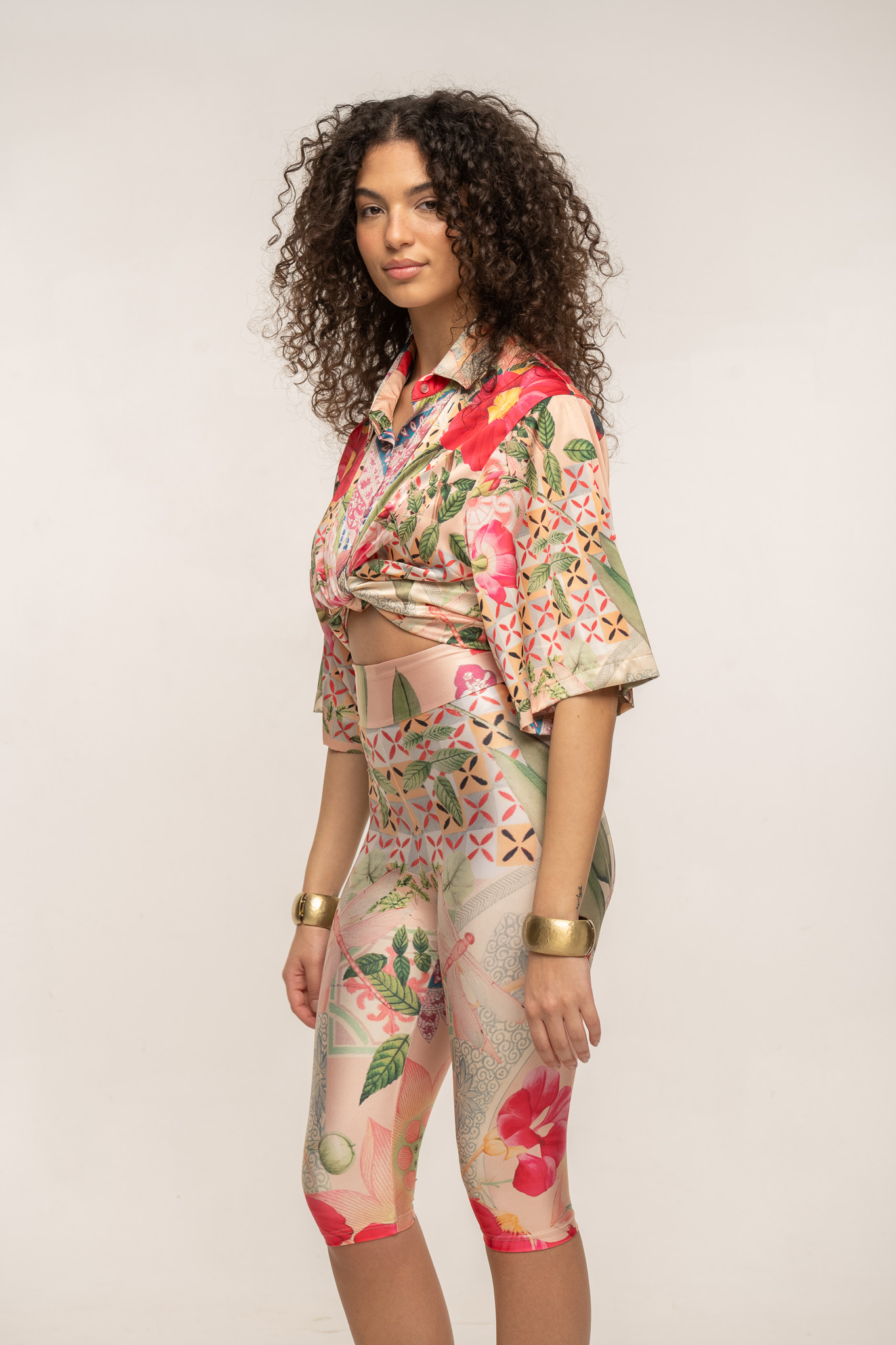 Fitted capri pants in printed stretch lycra with a clean, streamlined silhouette.