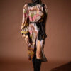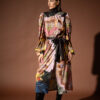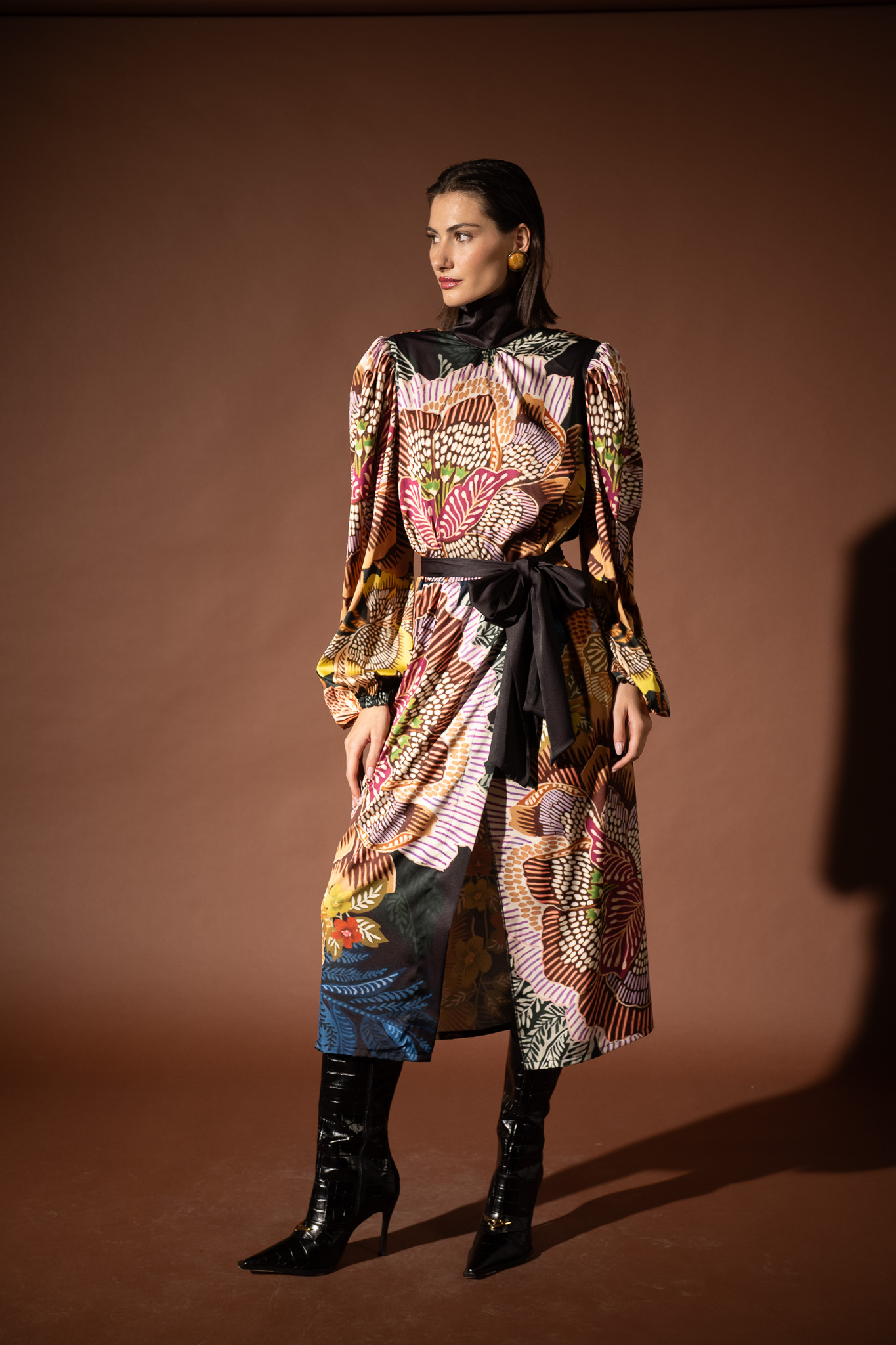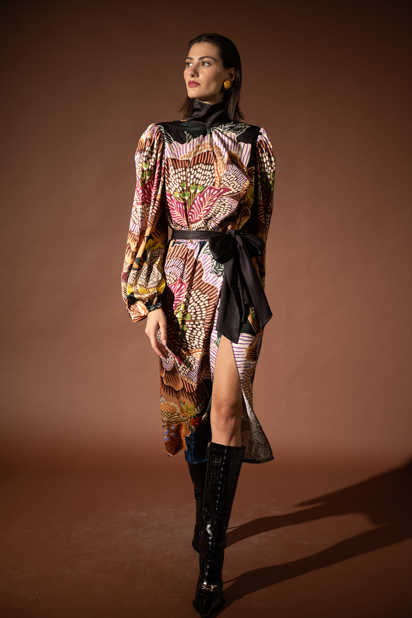 Make a statement with this luxurious satin midi dress, featuring a bold print pattern. Designed with a high neckline and long sleeves, it drapes beautifully on the body, offering both sophistication and comfort. The fluid satin fabric enhances movement, while the side slit adds a touch of modern allure. Finished with a self-tie belt to define the waist, this dress is perfect for evening occasions or elegant daytime looks.